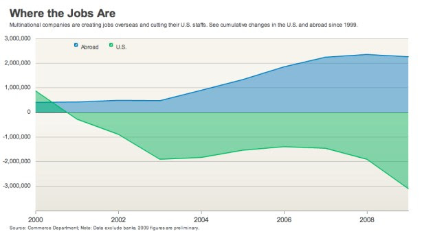 The companies cut their work forces in the U.S. by 2.9 million during the 2000s while increasing employment overseas by 2.4 million, new data from the U.S. Commerce Department show. That’s a big switch from the 1990s, when they added jobs everywhere: 4.4 million in the U.S. and 2.7 million abroad.